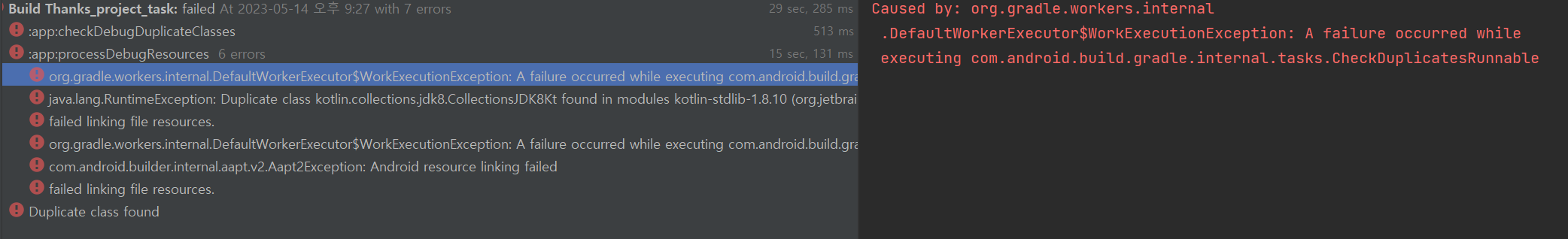 | 에러명 | Execution failed for task ':app:checkDebugDuplicateClasses'. > A failure occurred while executing com.android.build.gradle.internal.tasks.CheckDuplicatesRunnable > Duplicate class kotlin.collections.jdk8.CollectionsJDK8Kt found in modules kotlin-stdlib-1.8.10 (org.jetbrains.kotlin:kotlin-stdlib:1.8.10) and kotlin-stdlib-jdk8-1.7.20 (org.jetbrains.kotlin:kotlin-stdlib-jdk8:1.7.20) |