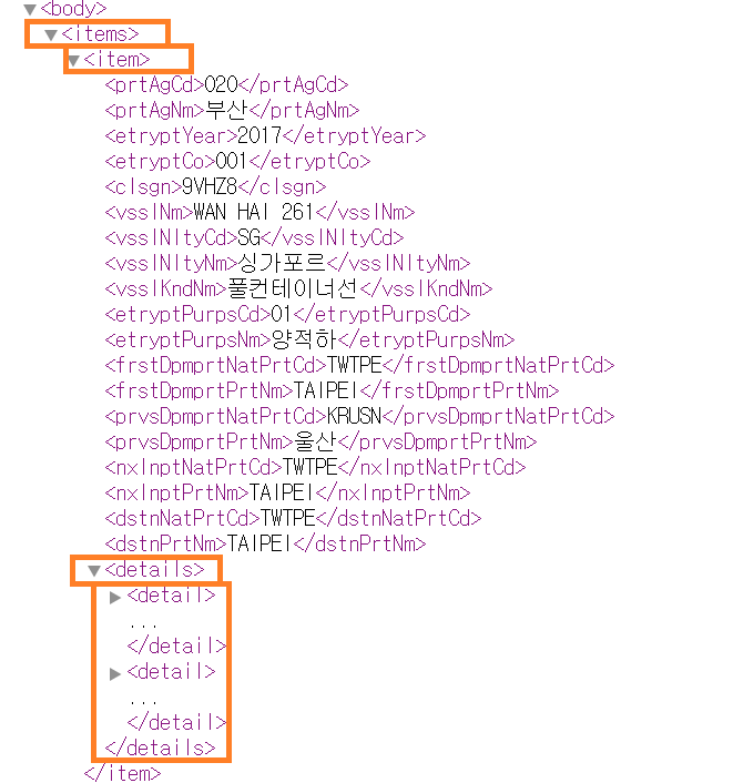 부모태그의 자식 태그로 <item> , <item>의 자식 태그로 우리가 원하는 결과값이 들어있다. 그리고 <item>에는 <details> 라는 좀 더 세부적인 정보를 담고있는 태그가 있으며, <detalis>의 자식 태그로 <detail>이 존재함을 확인할 수 있다.